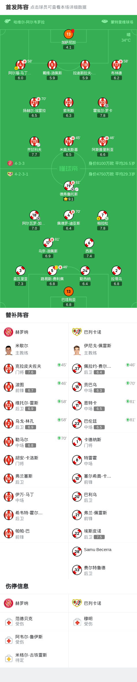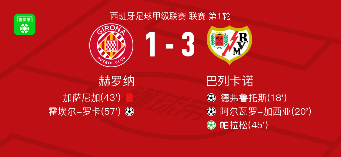 北京时间8月16日西班牙足球甲级联赛 联赛 第1轮,赫罗纳主场对阵巴列卡诺。赫罗纳霍埃尔-罗卡破门。巴列卡诺德弗鲁托斯破门,阿尔瓦罗-加西亚破门,帕拉松破门。最终比分赫罗纳 1-3 巴列卡诺。