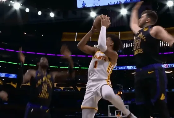 第二节比赛中,东契奇身后送出排球大帽,湖人轰出35-12超级进攻波领先23分。